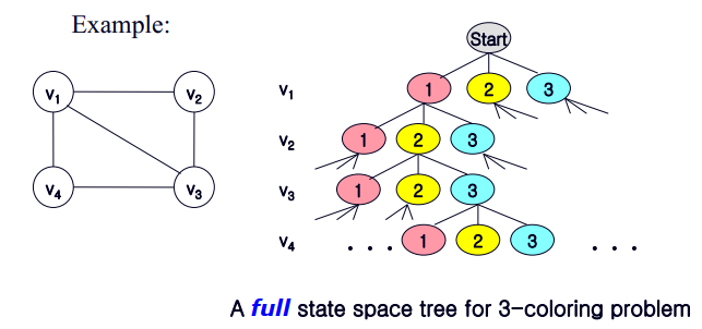 - 어떤 방향성이 없는 그래프가 주어졌을 때, 그래프의 각 노드에 m개의 색깔중 하나를 선택해서 칠함