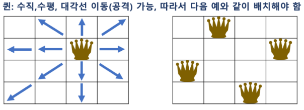 - 퀸은 다음과 같이 이동할 수 있으므로, 배치된 퀸 간에 공격할 수 없는 위치로 배치해야 함