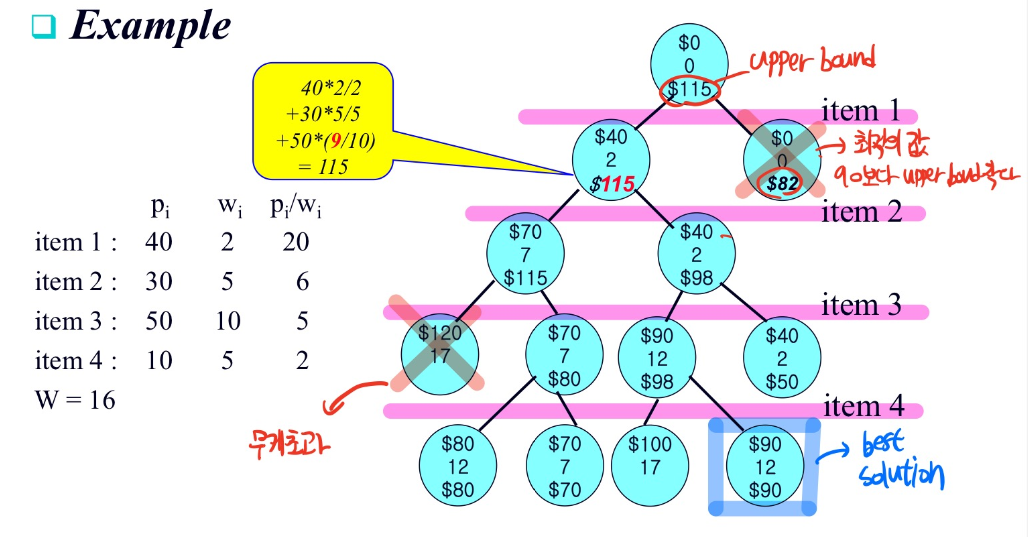 말이 조금 애매할 수 있지만, 정리하자면 현재 노드의 가능성, 즉 현재상태에서 최대로 얻을 수 있는 이득값(upper bound)를 계산하여 정보를 가지고 있다면, 탐색중 만약 현재 노드의 upper bound 보다 큰 가치(profit)값을 가지고 있는 다른노드가 존재 한다면, 현재 노드 아래의 값은 더 이상 최적이 값이 아니며 탐색할 필요가 없다는 뜻이 되므로 필요없는 노드들을 pruning 하고 backtracking을 할 수 있게 되는 겁니다.