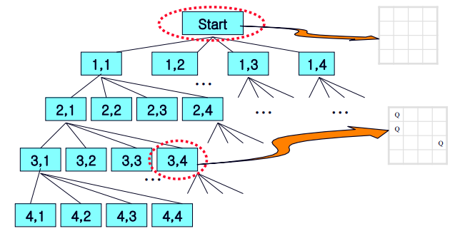 각 노드의 레벨은 체스판의 행번호와 같습니다. [1,1] 노드는 레벨이 1이므로 1행에 1열에 Queen을 배치하겠다는 의미입니다. 그림에서 보이는 것과 같이 [3,4]은 [1,1], [2,1] 상태에서 추가적으로 [3,4] 위치에 퀸을 배치된 상태를 의미합니다.