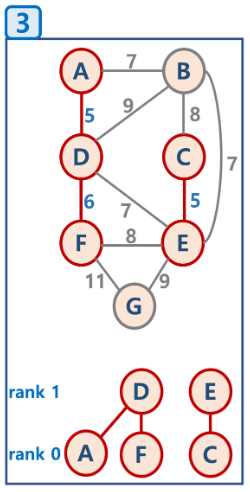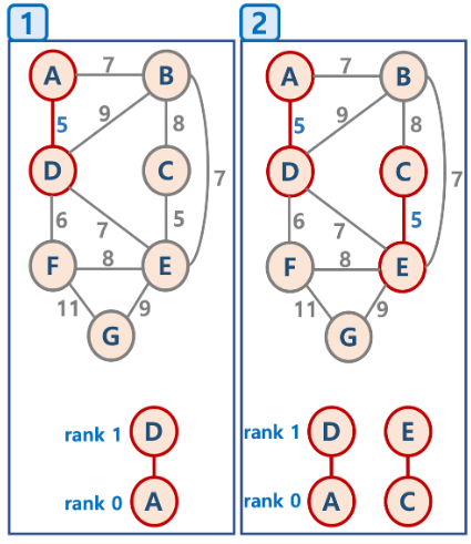 ( 위 그림에서는 리스트에 넣어진 간선은 빨간색, MST에 들어간 노드와 간선들은 파란색으로 표시해줍니다 )