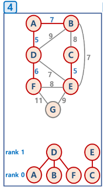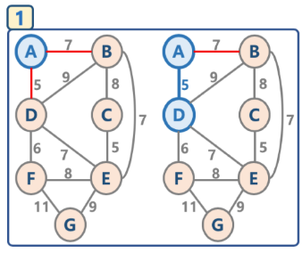 그림에서는 노드 A가 선택되고 A와 연결된 가중치 5, 7인 간선 2개가 간선리스트에 추가가되고, 따라서 리스트에 저장된 간선중 가중치가 최소인 (5 ,A->D) 간선을 꺼내서 조사를 합니다. (3단계 과정)