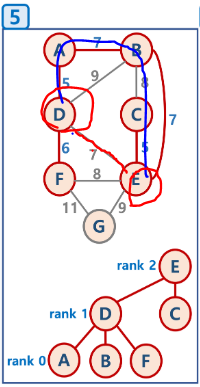노드 D와 연결된 간선들 리스트에 저장 -> 리스트에서 가중치 최소인 간선 (5, D->F) 추출 -> 연결된 노드집합에 F가 없으므로 노드집합에 추가 -> (5, D->F) 간선을 '최소 신장 트리'에 삽입 -> 간선리스트에서 (5, D->F)제거